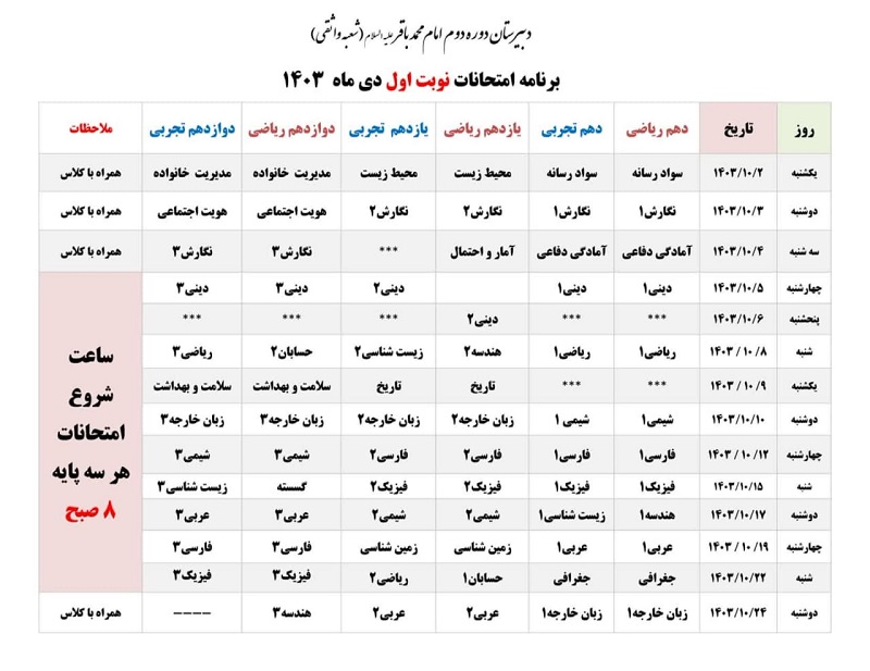 برنامه امتحانات نوبت اول